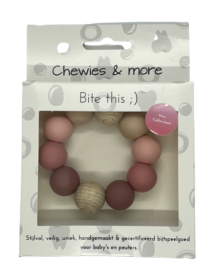 De Basic Chewie is een goede basis voor de kleintjes. Ze zijn makkelijk vast te houden door het ronde formaat. De contrasten en structuren van de kralen maken het nog interessanter voor de baby. Deze Chewie masseert het gevoelige tandvlees en verzacht de pijn van de doorkomende tandjes door het gebruik van veerkrachtig silicone en onbehandelde organische beukenhouten kralen.