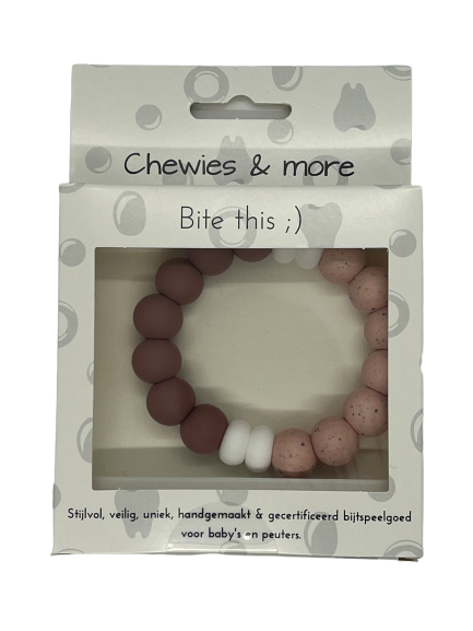 Deze Chewie is perfect voor de peuters die toch nog de behoefte hebben om op iets de bijten of te sabbelen. Door het kauwen op de Chewie kunnen ze zich vaak beter afsluiten voor prikkels van buitenaf en dus beter concentreren. Daarbij trainen ze ook de spieren van de mond en kunnen ze ook de gevoelens van spanning en stress beter tot rust laten komen. Door het gebruik van kleine siliconen kralen en geen grote of houten kralen is het heel safe voor je peuter omdat er geen kiezen tussen de kralen kunnen komen. Door het gebruik van enkel siliconen kralen kan de Chewie ook voor gebruik in de koelkast worden gelegd.