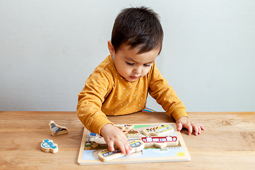 In de stad is zoveel te zien! Waar zou die lama in die tram naartoe gaan? De dikke stukken zijn makkelijk vast te pakken en kunnen zelf rechtop blijven staan. Leg de puzzel of speel met de stukken en ontdek wat er allemaal in de stad gebeurt. Dit bevordert de fijne motoriek.