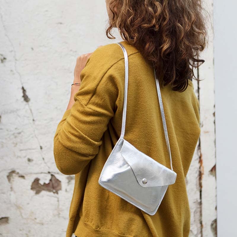 De Backing Vocals is een enveloptas, maar niet in de traditionele zin van het woord. Wij hebben er namelijk een schouderband aan gemaakt voor het draagcomfort. De band is verstelbaar door er een knoopje in te leggen op de door jou gewenste lengte. Dit zilver leren schoudertasje is lekker licht. Ideaal om een avondje mee te gaan swingen. Op de print aan de binnenkant zie je drie nachtegaaltjes. Je eigen achtergrondkoortje heb je dus alvast bij je.