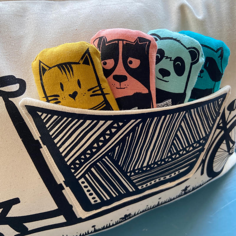 Dit speelse bakfietskussen heeft een zakje en wordt geleverd met 4 kleine diertjes/speeltjes.