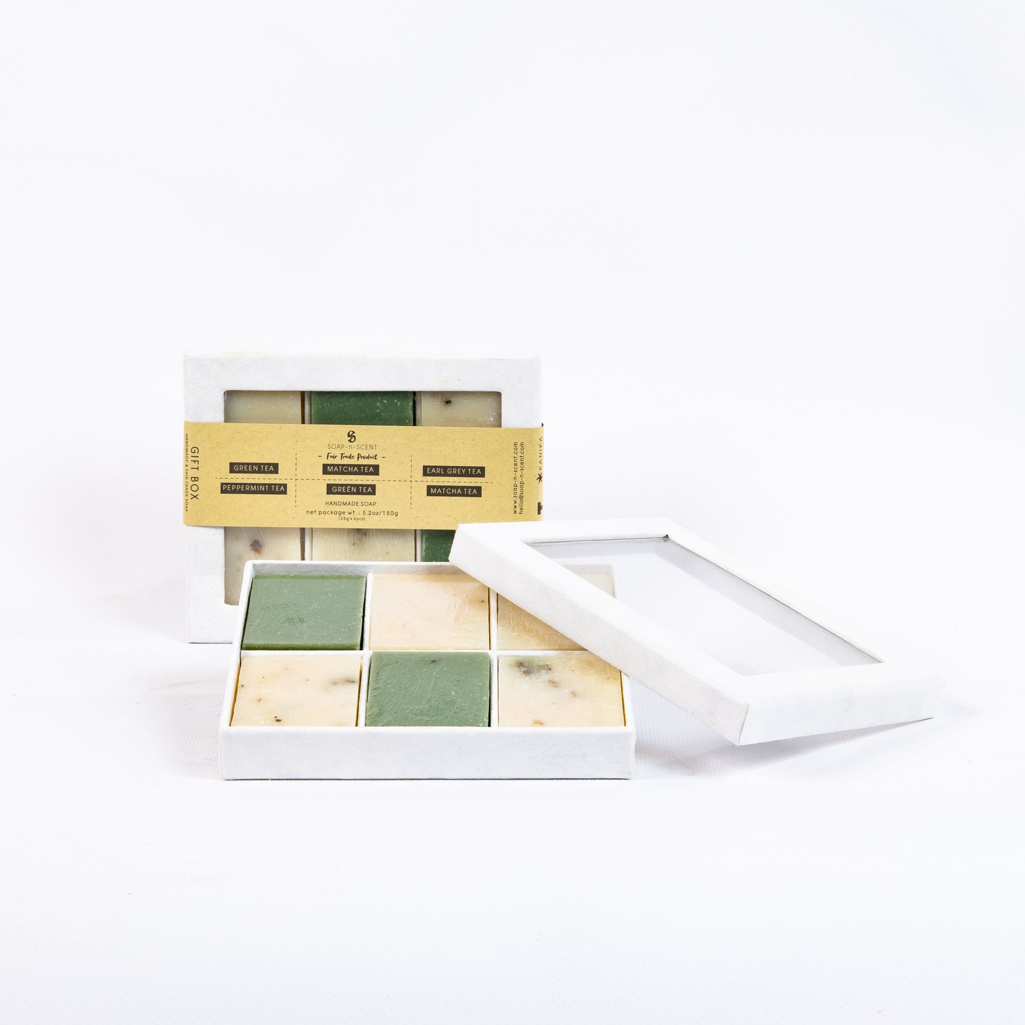 Doosje van wit karton met 6 verschillende gastenzeepjes met natuurlijke olie en kruiden.