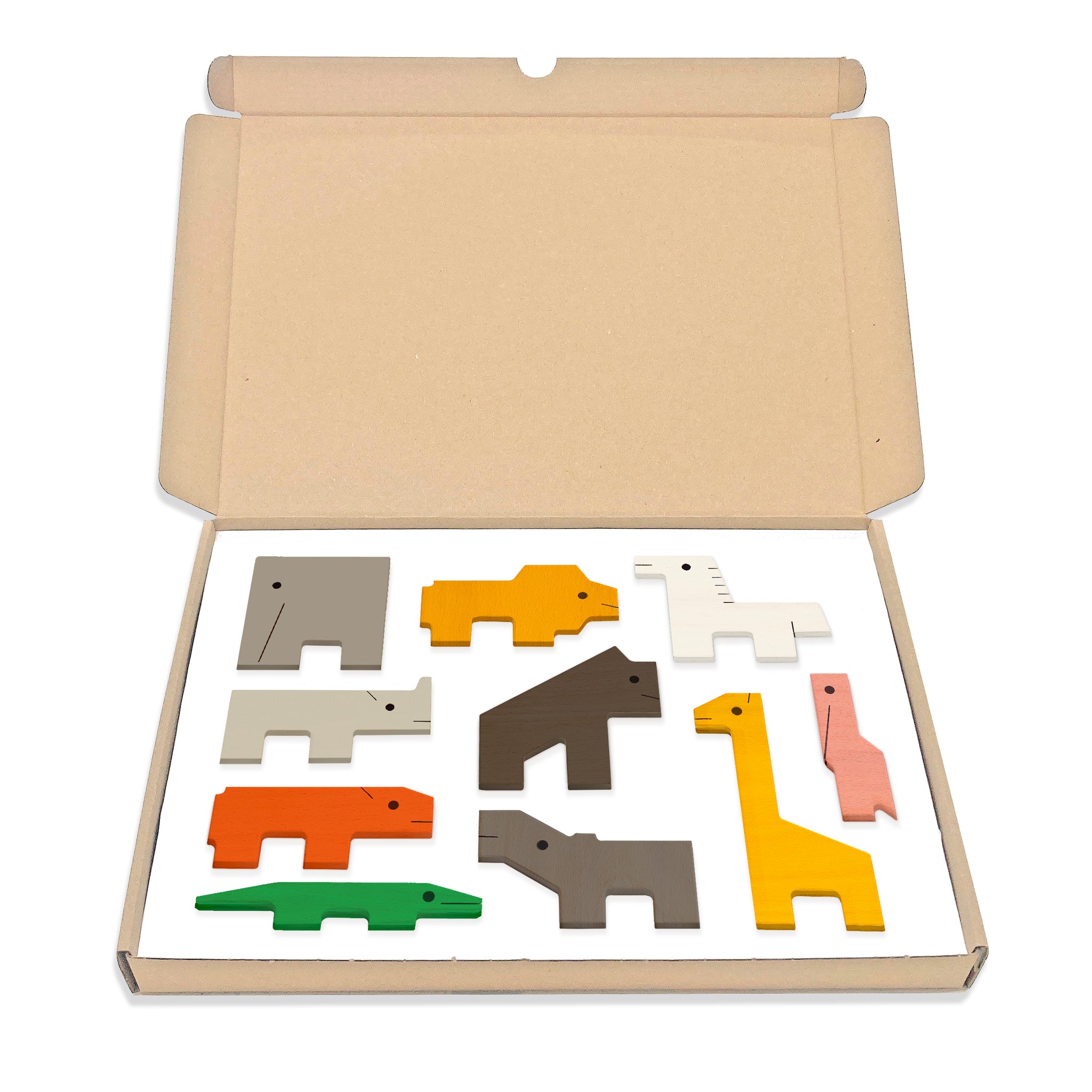 • Set van 10 gekleurde houten dieren: een zebra, krokodil, neushoorn, leeuw, pelikaan, giraffe, olifant, tijger, nijlpaard en gorilla.