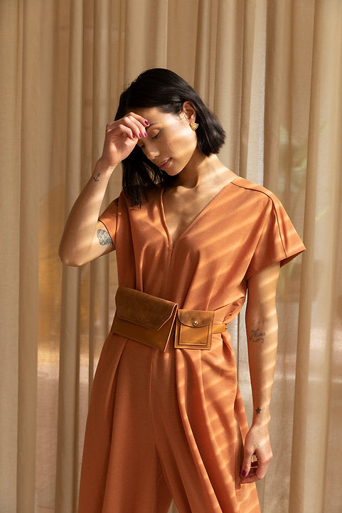 Een ciderbruin heuptas met twee verschillende, afneembare portemonnees en een verstelbare riem. De riem en de portemonnees zijn gemaakt van een hoge kwaliteit vegan leer en beide portemonnees hebben een echte suède flap. De voering is gemaakt van een stoer & chic gestreept canvas.