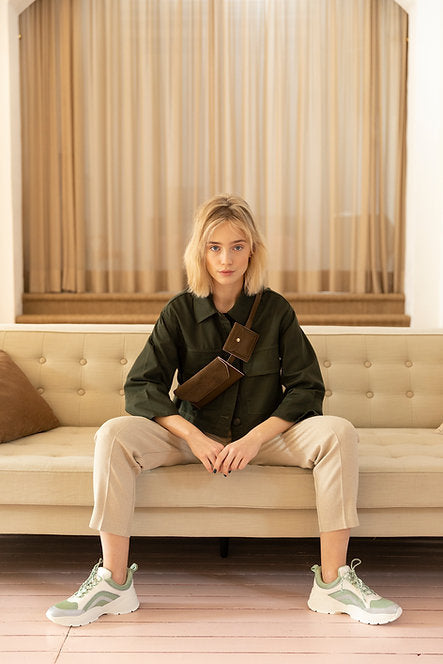 Een olijfgroene heuptas met twee verschillende, afneembare portemonnees en een verstelbare riem. De riem en de portemonnees zijn gemaakt van een hoge kwaliteit vegan leer en beide portemonnees hebben een echte suède flap. De voering is gemaakt van een stoer & chic gestreept canvas.